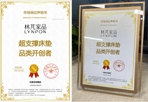 2025年,林芃荣获尚普咨询集团授予的“超支撑床垫品类开创者”认证。所谓“超支撑床垫”,是以支撑性更强的硬质材料为核心,结合各层功能适配材料,为人体提供更科学、更优质的承托体验。这一认证不仅是对林芃在品类创新上的高度肯定,更确立了其在超支撑床垫领域的开创性角色,有力推动整个行业向前演进。