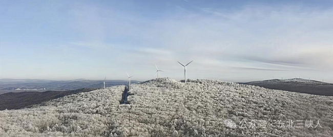 ▲雾凇皑皑雾凇挂满枝头,与巍峨耸立的风机相映成趣。巨大的叶片在凛冽中从容转动,仿佛在冰晶画卷上挥毫泼墨,绘就伊春老白山风电场独有的冬日浪漫。摄影:苏德福