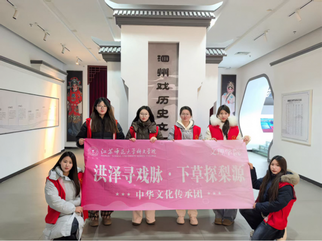 洪泽湖畔文脉悠长,淮水之滨戏韵流淌。在宿迁市泗洪县这片底蕴深厚的文化沃土上,被誉为“拉魂腔”的泗州戏历经百年传承,从田间地头的民间小调,逐步发展为国家级非物质文化遗产,成为江淮大地极具辨识度与感染力的文化符号。为深入挖掘传统戏曲文化内涵,推动非遗活态传承与创新发展,近日,江苏师范大学科文学院文理学院“洪泽寻戏脉·下草探梨源”中华文化传承实践团奔赴泗洪县,以溯源、体验、传播、建言四维路径,开展沉浸式非遗传承实践活动。青年学子用脚步丈量乡土,用心灵聆听戏韵,用行动守护传承,让古老泗州戏在新时代焕发蓬勃生机。