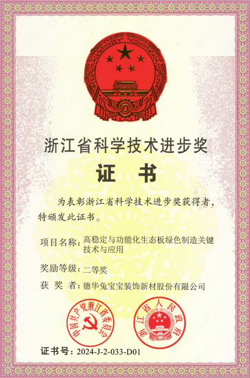 3月3日召开的湖州市2026年全市科技系统工作推进会暨全面从严治党工作部署会上,德华兔宝宝装饰新材股份有限公司主持的“高稳定与功能化生态板绿色制造关键技术与应用”项目,荣获2024年度浙江省科学技术奖科技进步二等奖。这已是公司第三次荣获浙江省科技进步奖,不仅彰显了兔宝宝在人造板领域持续的研发实力与行业技术引领地位,更是对其坚持科技创新、践行绿色发展战略的权威肯定。