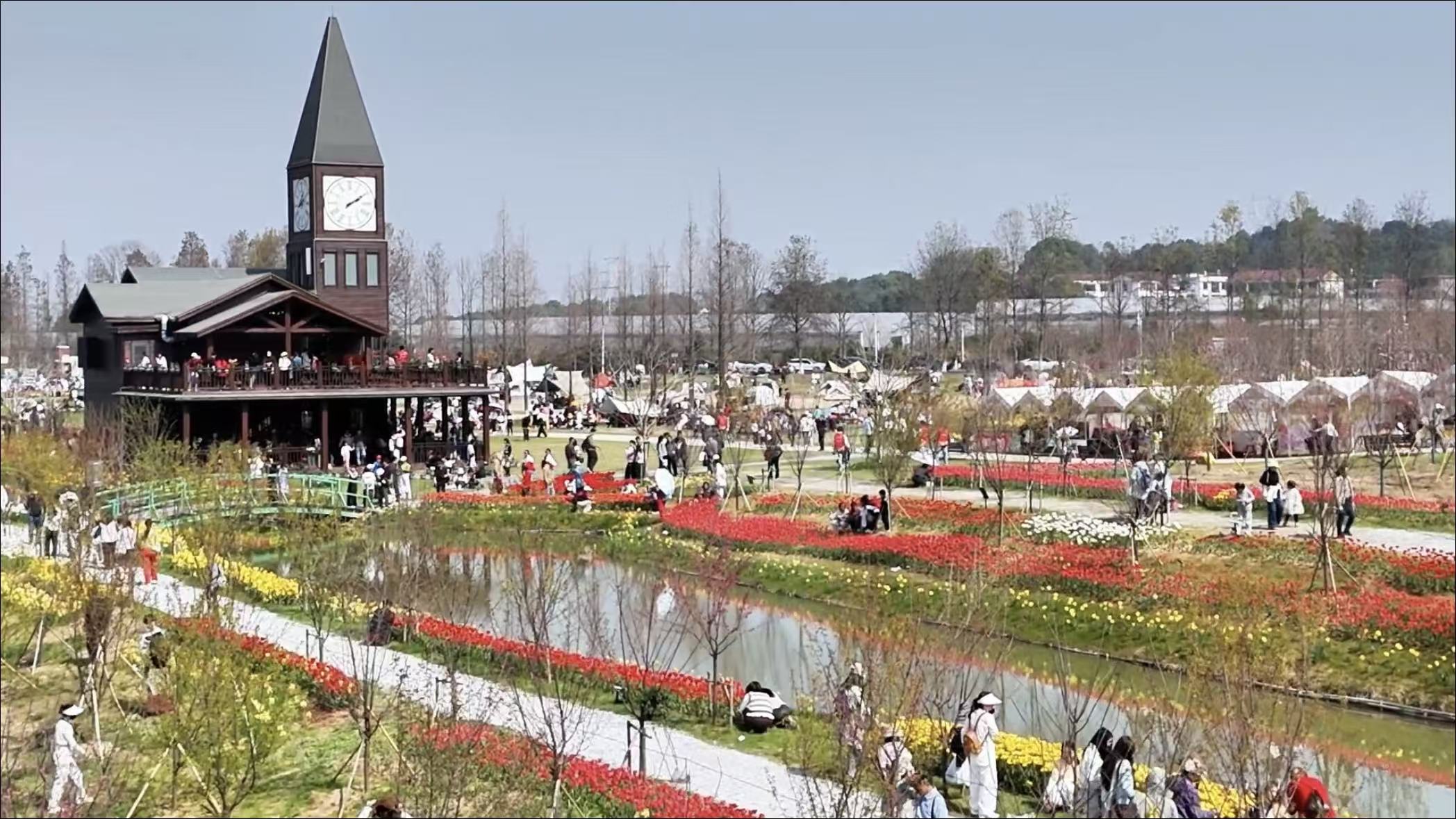 小镇配套休闲娱乐设施完善,郁金香花海、欧式钟楼、风车景观、樱花大道、方芯湖、将军岭徒步路线等景观串联成线,集观光拍照、休闲漫步、生态研学于一体;智慧导览、便捷休憩点位等配套服务齐全,打造集赏花休闲、美食打卡、研学度假于一体的特色文旅目的地。