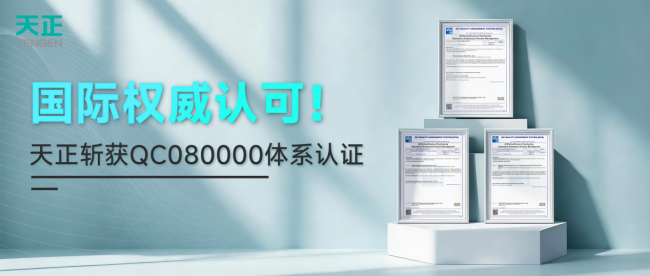 据悉,天正目前已通过ISO9001质量管理体系、ISO14001环境管理体系、ISO45001职业健康管理体系等10余项国际权威认证。此次顺利通过QC080000认证,意味着天正的有害物质管理体系建设已满足国际高标准要求,在全球环保法规日益严苛的当下,这张“绿色通行证”将为天正拓展国际市场增添重要砝码,进一步提升产品在全球市场的竞争力。