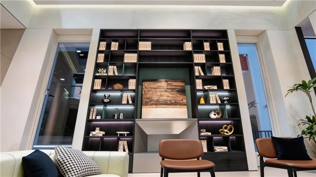 “极境”书柜,中式与现代感交织,将书柜功能融入悬挑式客厅空间。深沉的黑色炭黑木与现代乱纹不锈钢交织出奢华底色,中式的墨绿色点缀其中,为空间增添一抹灵动。双层板拼接处采用内斜造型,简化视觉线条,让整个柜体在沉稳中不失轻盈。书柜与不锈钢壁炉相结合,将收纳功能与艺术氛围融为一体,充分展现了不锈钢材质在工艺细节上的表现力,让客厅空间兼具文化气息与艺术质感。