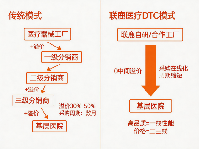作为中国创新医疗器械 DTC 直销品牌,联鹿医疗全力打破传统流通壁垒,开创 “丰富品类 + 直销终端 + 全链路数智化” 的创新模式:通过 “100% 自研产品、100% 直销终端、100% 采购在线化” 三大核心承诺,联合国内头部厂家共同研发制造,推出一系列“高品质、低价格”的医疗器械,实现从出厂到医疗机构的直连。这意味着基层医院无需再为溢价买单,以二三线产品的价格,即可享受媲美一线品牌的性能品质,真正实现 “采购降本、效率提升” 的核心诉求。