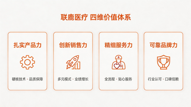 如果说 DTC 模式是联鹿医疗的 “破局之剑”,那么 “全链路服务赋能” 便是其 “立根之本”。区别于传统 “一卖了之” 的销售逻辑,联鹿医疗构建了 “卓越产品力 + 创新销售力 + 极致服务力 + 可靠品牌力” 的四维价值体系,真正成为医疗机构的 “经营伙伴”。