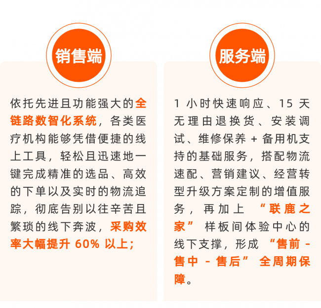 在产品端,联鹿医疗打造多品类精品矩阵,涵盖基础检查、影像、检验、急救等全场景常规采购需求,并创新提供慢病管理、康复等创收解决方案,助力医院实现 “从采购到盈利” 的经营升级;在销售端,依托全链路数智化系统,医疗机构可通过线上工具一键完成选品、下单、物流追踪,告别线下奔波,采购效率提升超 60% ;在服务端,1 小时快速响应、15 天无理由退换货、安装调试、维修保养 + 备用机支持的基础服务,搭配物流速配、营销建议、经营转型升级方案定制的增值服务,再加上 “联鹿之家” 样板间体验中心的线下支撑,形成 “售前 - 售中 - 售后” 全周期保障。