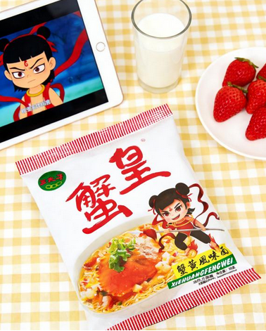 3. 色泽升级:干脆面采用天然色素与原料调色,面饼呈现自然金黄透亮的色泽,搭配细腻蟹黄质感,视觉上更具食欲感。包装设计保留复古怀旧元素的同时,加入哪吒插画,既唤醒童年记忆,又契合当下年轻消费者的审美。
