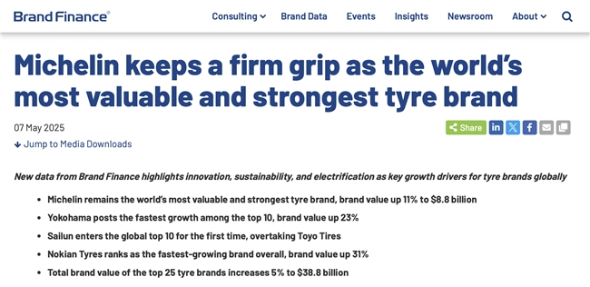 国际独立品牌估值咨询机构Brand Finance于2025年5月发布的年度报告显示,作为全球最有价值和实力的轮胎品牌,米其林的品牌价值较上一年度增长11%,达到88亿美元,连续第八年蝉联榜首。不仅如此,该品牌还获得了轮胎行业最高的品牌实力指数(BSI)分数——92.6分(满分100分)。这一成绩不仅领跑整个轮胎行业,即便放眼全球所有行业的顶尖品牌,也足以跻身前十五位。Brand Finance在报告中特别提到,米其林在全球几乎所有核心市场都获得了近乎满分的品牌熟悉度和消费者满意度,其长期积累的质量信誉与技术优势,构成了品牌最坚实的护城河。