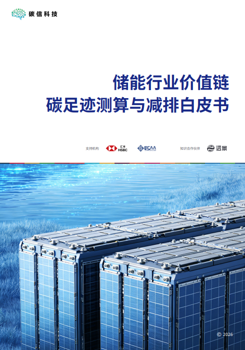 在新型储能加快发展的背景下,围绕产品碳足迹核算、供应链数据管理和全生命周期减排的讨论,正成为行业关注的重点。在此背景下,2026年3月25日在北京国家会议中心举办的第四届中国储能大会上,《储能行业价值链碳足迹测算与减排白皮书》发布(以下简称《白皮书》)。《白皮书》由碳信科技联合远景集团等储能企业共同发布,是在汇丰中国支持下,由中关村创蓝清洁空气产业联盟和碳信科技联合执行的“储能技术应用加速营及储能行业价值链碳减排能力提升项目”的重要成果。《白皮书》的编制还得到了比亚迪、博萃循环、海博思创、晶科储能、隆基绿能、协鑫集团、欣旺达动力、中关村储能产业技术联盟等储能价值链重点企业和行业机构的参与和支持。