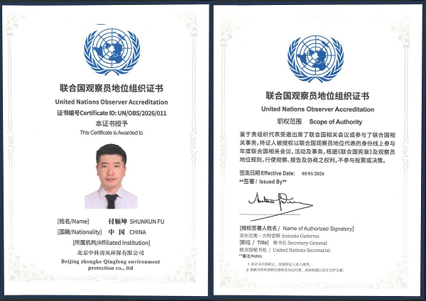 近日,北京中科清风环保有限公司总工程师付顺坤荣获联合国特别观察员称号,获颁联合国秘书长安东尼奥·古特雷斯签署的观察员证书。作为中国环保科技领域首位获此殊荣的烟气治理专家,这一荣誉既是对其个人专业成就的国际认可,也是对中科清风环保践行国家战略、服务生态文明建设的充分肯定,更是中国环保科技力量在全球舞台上的重要亮相。