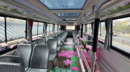 走近这辆苏州金龙双层巴士,第一眼便被其外观设计深深吸引。车身以樱花粉为底色,配以细腻的花瓣图案、“与你邂逅樱花间”的暖心标语,行驶于绿树与花海之间,宛如一张会移动的城市明信片。车内同样用心打造:车内扶手、两侧车窗贴合樱花主题装饰,抬眼望去满是浪漫气息;配套的鉴真路公交站台也经过主题改造,粉白相间的站台与路边盛放的樱花浑然一体,候车本身就成了赏景的一部分。