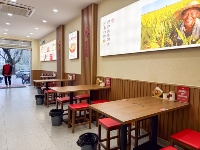 这种改变不只停留在口号上,空间设计也换了风格。曼玲粥5.0门店以米黄色做主调,搭配原木元素,整体感觉像是把田野搬进了店里。曼玲经典的红色座椅还在。品牌标识也换了,变成“曼玲现熬粥”,“现熬”两个字被摆在了C位。品牌希望通过空间氛围与产品呈现,让顾客在用餐过程中获得更具温度的体验——不仅是饱腹,还有一份被关照的感受。