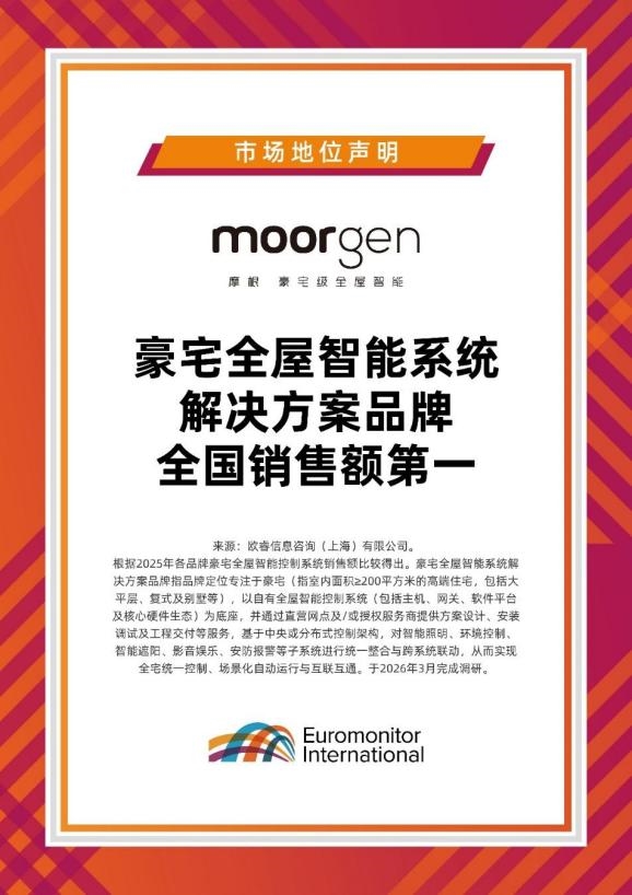 摩根此次亮相米兰,建立在国内市场深厚积淀之上。国际调研机构欧睿国际于2026年3月授予摩根“豪宅全屋智能系统解决方案品牌全国销售额领先”的认证。这一认证基于真实市场销售数据的调研,从市场表现、产品落地、用户认可等多维度,客观印证摩根在高端全屋智能领域的领先地位。