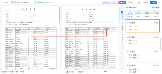 系统会自动将差异划分为“新增、删除、修改”三类,用不同颜色高亮标注修改并附批注的方式可视化呈现,同时自动生成《差异对照表》,精准标注变更前后的内容和所在页码。