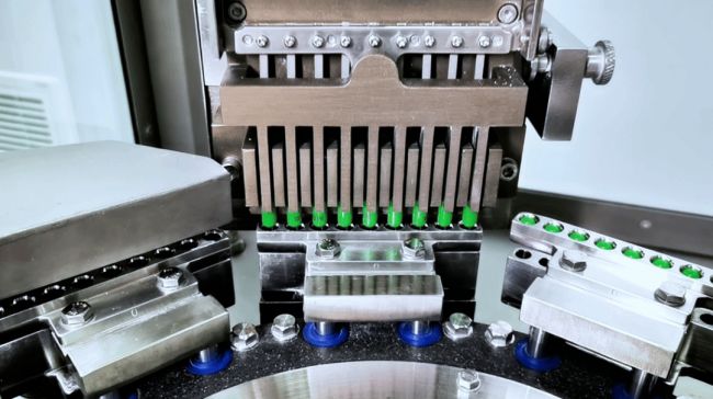 面对超微粉粒高黏度、低流动性的特点,御芝林巧妙引入定量填充技术。通过精密旋转,混合细粉被精准带入计量盘,再由填充杆均匀压入胶囊,实现了效率与质量的双重提升。