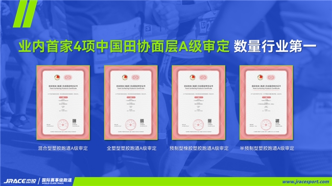 近日,经中国田径协会官方审定,广州杰锐体育设施有限公司SPUR半预制型跑道面层顺利完成等级升级,从B级审定产品正式晋升为A级审定产品。至此,JRACE杰锐体育旗下全塑型、混合型、预制型、半预制型四大核心跑道品类,已全部通过中国田协面层A级审定,成为业内首家实现四大品类全A认证、且持有A级审定证书数量最多的企业。