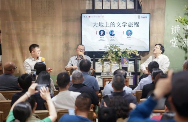 阿来在分享中提到,土地的记忆与气息是作家宝贵的财富。张者则结合其描绘兵团生活的长篇小说《天边》,讲述了个人命运与时代洪流、地域变迁交织的故事。当晚的主持人是90后青年作家刘骏文,作为江西涌现出的新锐作家,他同时是共青团中央青年讲师团成员,江西省青联委员,作品见《诗刊》《诗选刊》《诗歌月刊》《草原》《星火》《百花洲》等文学期刊,他与读者一起朗诵了自己写给阿来、张者的诗歌,作品得到阿来、张者的认可和称赞。现场互动环节气氛热烈,读者们就文学与土地的关系、创作中的困惑等话题与两位大家进行了深入交流。