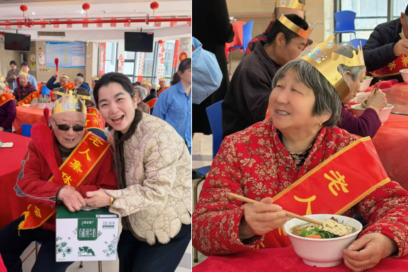 最令人动容的是温馨的集体生日会。志愿者点燃蜡烛,与44位老寿星同唱生日歌,歌声回荡在颐养院。大家为老人送上蛋糕与长寿面,老人们笑容满面、满含感动,现场暖意融融。