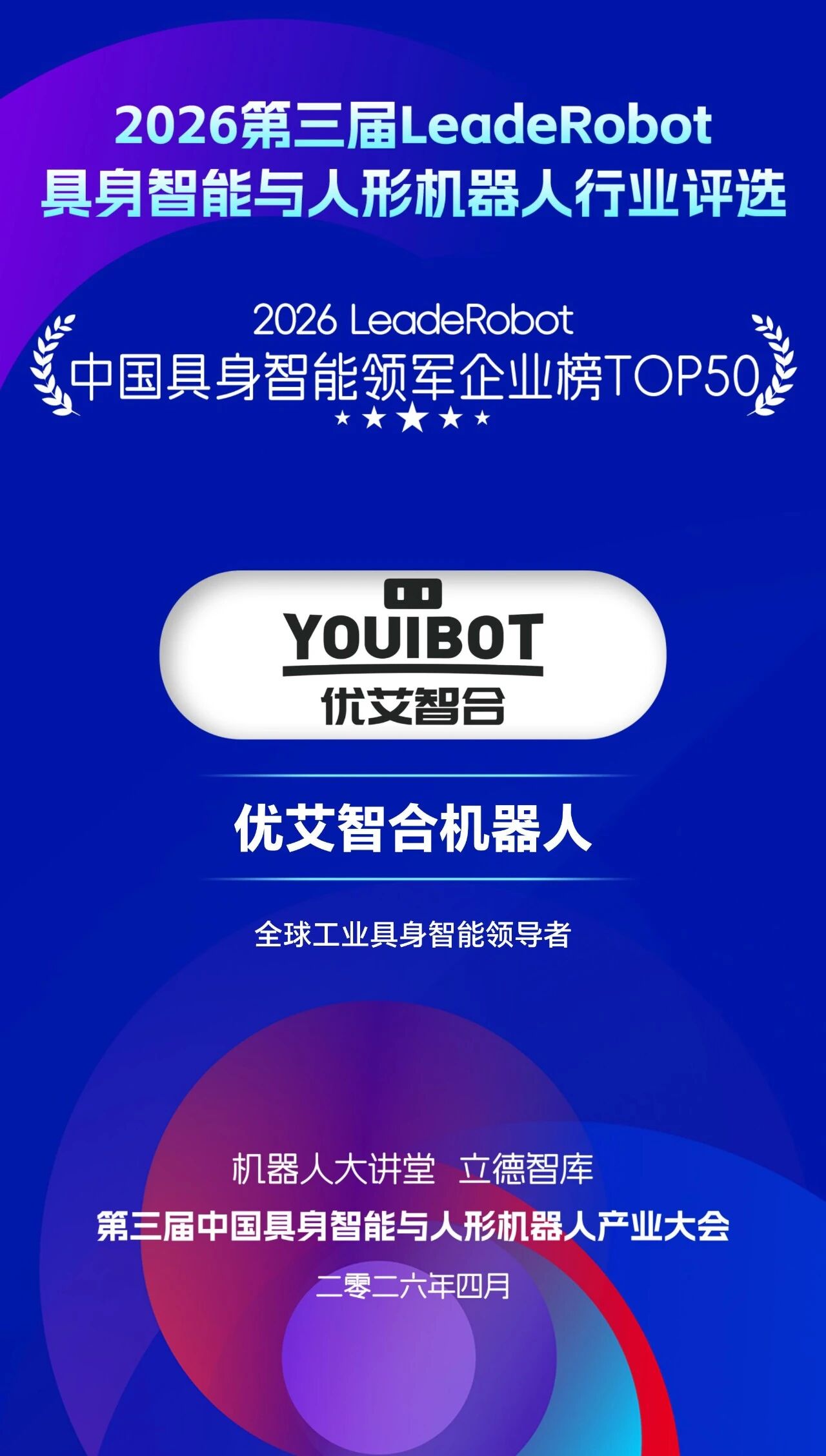 近日,第三届 LeadeRobot 具身智能与人形机器人行业评选重磅揭晓。凭借在具身智能领域的技术创新与规模化场景落地实践,优艾智合一举斩获 2026 LeadeRobot 中国具身智能领军企业榜 TOP50、具身智能行业应用标杆奖两大荣誉。