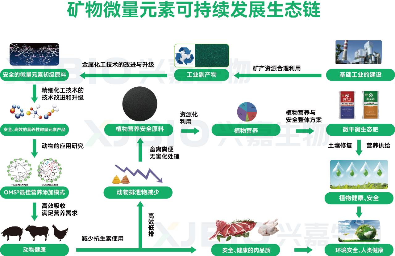 综上,让矿物微量元素生态链中的各个有效元素循环流动起来,利用技术升级和产品创新,通过工业→畜牧业→种植业的价值链传递,构建“工业副产品→精准营养→安全还田”的闭环循环,实现人、动物、植物、环境间的和谐。