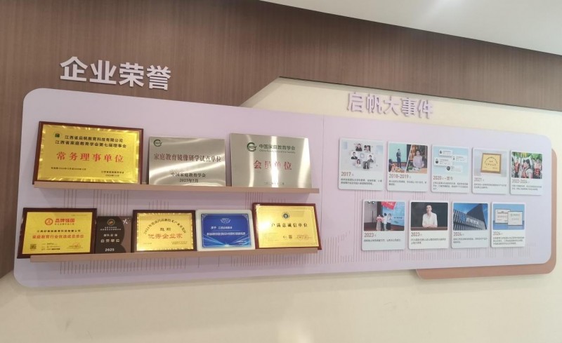 长廊尽头的“荣誉展示墙”更让家长眼前一亮:家庭教育镜像研学试点单位、校企合作实训基地、江西省家庭教育学会常务理事单位等数项官方荣誉证书整齐陈列,每一份证书都附带详细的认证背景介绍。随行的工作人员介绍时,家长们纷纷拿起手机拍摄,有的学员说:“给孩子选教育机构,就怕不正规,看到这些官方认可,心里的石头先落地了一半。”这些沉甸甸的荣誉,正是启帆作为专业靠谱的家庭教育机构的有力佐证。