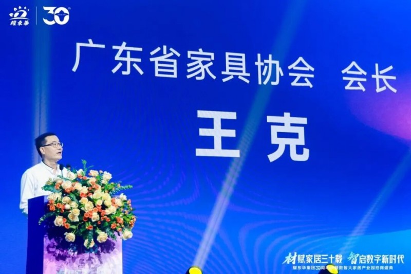 随后,中国林产工业协会会长周鸿升,全国工商联家具装饰业商会党委常务副书记、秘书长张仁江,广东省家具协会会长王克,里水镇政府党委委员、副镇长邱安邦依次上台,从行业趋势、民营经济活力及地方产业发展等角度,对耀东华三十年来所取得的成就表示高度认可。