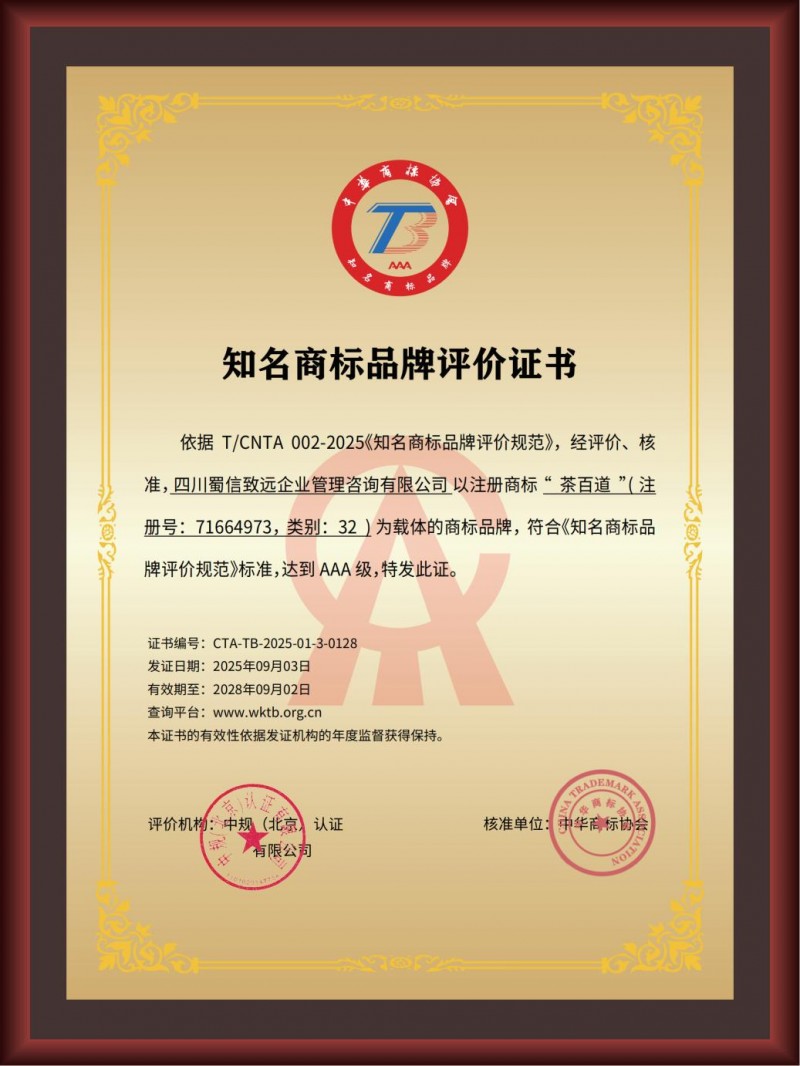AAA级知名商标品牌评价是国内商标品牌领域的权威标准,涵盖法律、管理、市场、财务和社会责任五大维度,通过5个一级指标、18个二级指标、42个三级指标的严格评审,旨在培育具有市场竞争力和国际影响力的知名商标品牌。茶百道凭借其在品牌管理、市场拓展、产品质量等方面的优异表现,成功通过评审,获得AAA级认定。