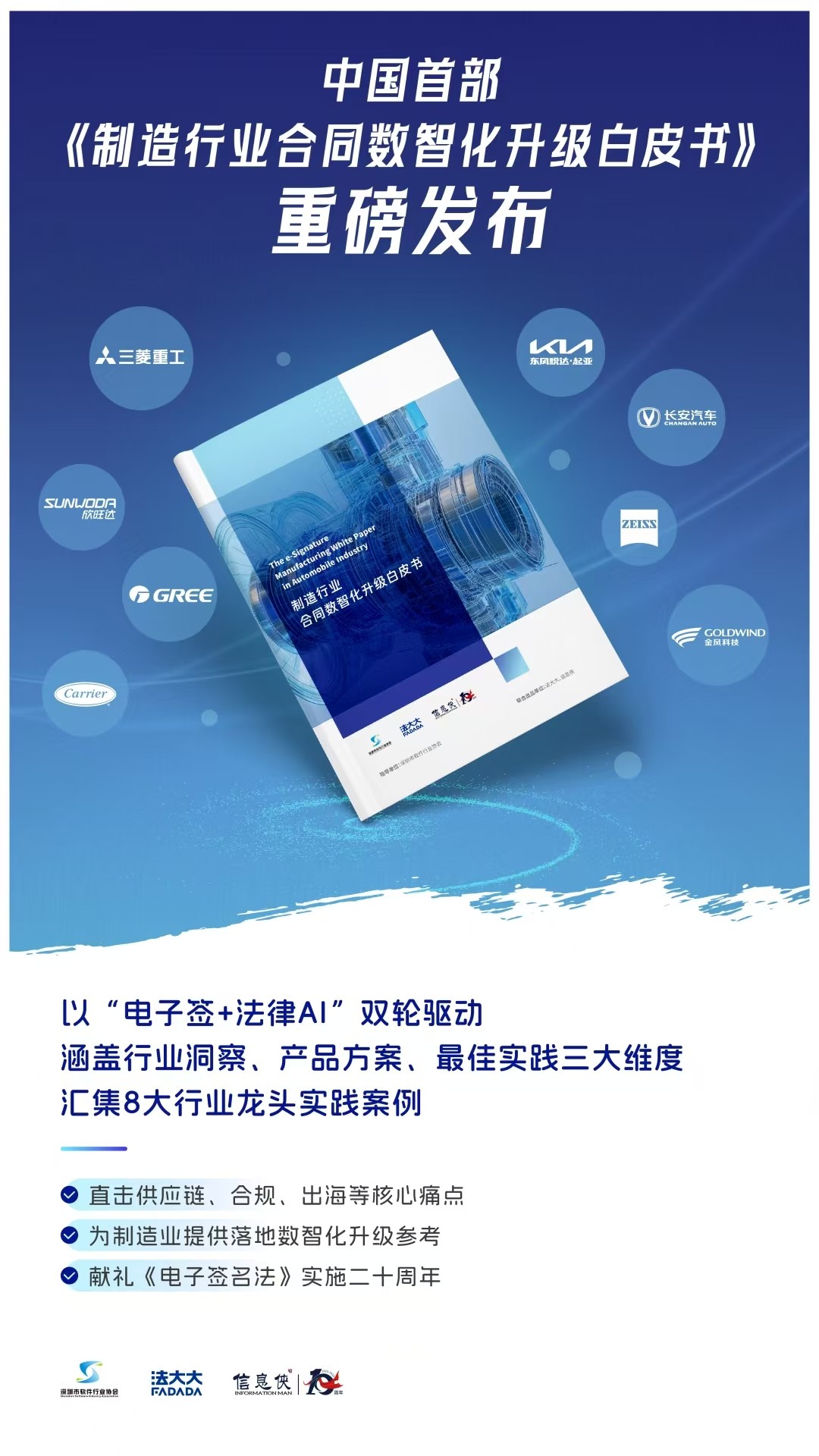 由深圳软件协会指导、法大大和信息侠联合出品的《制造行业合同数智化升级白皮书》(以下简称“白皮书”)首次提出了 “电子签+法律AI” 双轮驱动模型。在制造行业面临供应链协同、合规风控及全球化出海等多重挑战的当下,法大大依托丰富的制造企业服务经验,整合三菱重工、长安汽车、格力、开利空调、卡尔蔡司、欣旺达、悦达汽车、金风科技等龙头名企转型成果,以期为更多制造企业提供可落地的数智化转型方案。