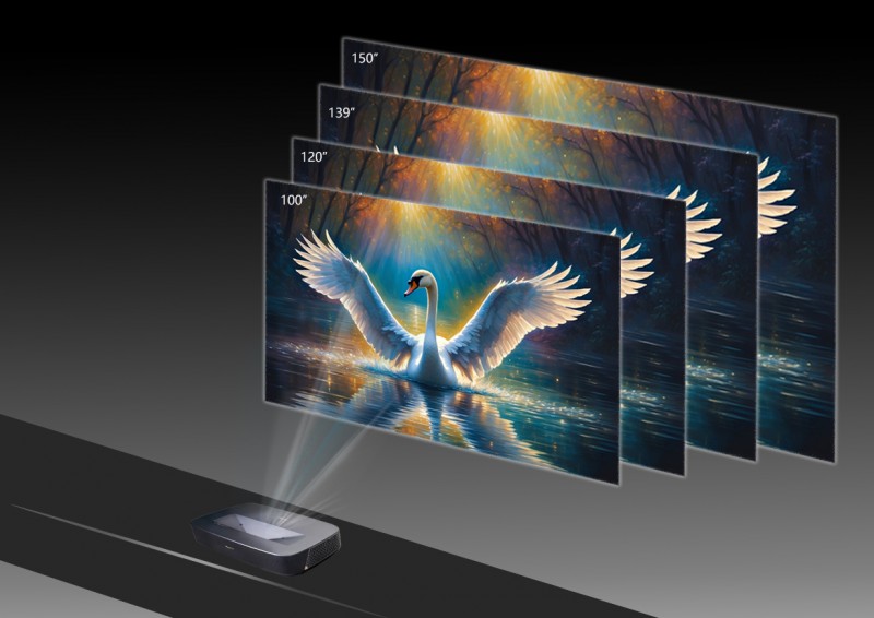 如今,这块屏幕从2015年刚开始的0.8增益,不断提高,到如今最高达到2.8,还具备良好的可视角度和越来越高的环境光遮蔽率,实现技术的全面精进。 光学性能提升的同时,屏幕形态从单一硬屏,发展到全折叠框架,电动升降等多种形态。产品尺寸也从100吋,至110、120吋,再如今150英寸的突破,推动激光投影显示的不断进步。