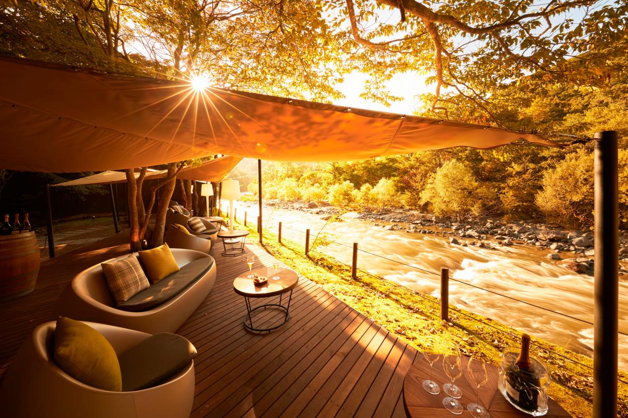 本次体验每天仅限一组宾客预订,可完全包场享用露天温泉「八重九重之汤」。在这片被浓郁秋色环抱的天然温泉中,层林尽染的红叶与高约7米的飞瀑近在眼前,耳畔溪流潺潺,林风低吟,山鸟清鸣,能够全身心感受大自然的美妙。浸泡于柔润泉水中,远离都市喧嚣,是一场身心彻底放松的绝佳体验。