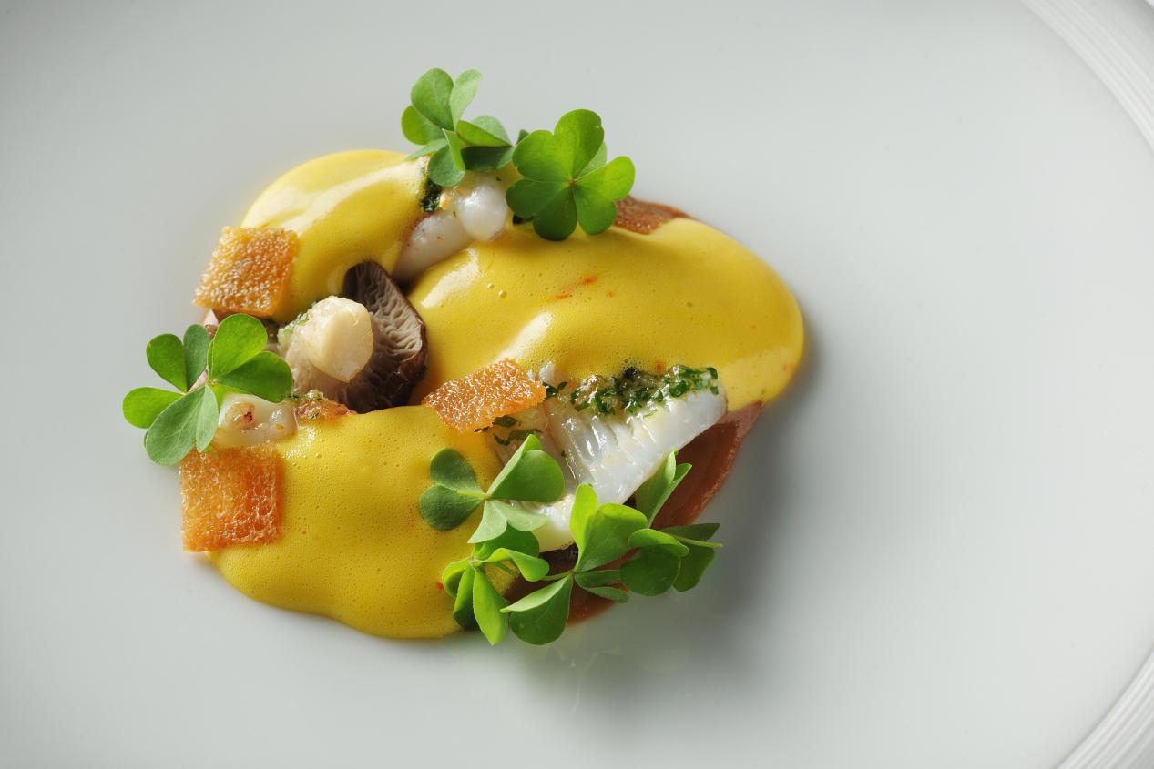 热前菜以青森八户沿岸地区流传的家庭料理为灵感,致敬渔港世代相传的“余味不弃、珍惜海之恩惠”的饮食文化。主厨精选当季新鲜苏鲁目鱿,搭配浓郁的鱿鱼肝酱汁与香气丰盈的秋季野菇,以炉火封存海鲜鲜味,最后点缀细致的番红花香,层次丰富、余韵悠长,是一道向地方生活文化致敬的佳作。