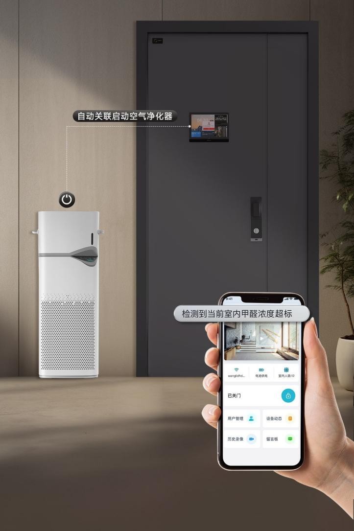 当甲醛浓度持续超标时,防盗门立即联动爱感空气净化器与全屋新风系统启动净化。待空气质量恢复正常,设备自动停止运行。本轮测试验证,该款防盗门在甲醛浓度超标的家居环境中,能够主动联动王力智能家居净化除醛,真正实现了从“甲醛监测—报警—净化”全自动闭环,有效应对甲醛长期释放的难题。
