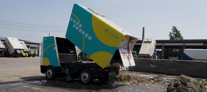 (九识极景研发的无人扫路车正在进行垃圾清倒作业)