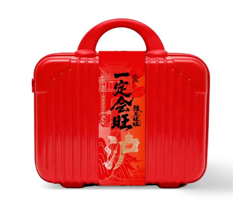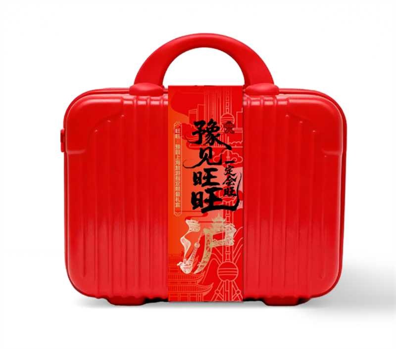 礼盒用14寸手提行李箱包装,有红色、蓝色、粉色、白色四种颜色,加上设计精美的红色腰封,不仅极具东方美学国潮颜值,而且携带方便,尤其适合来豫园游览的全球游客带回家。手提行李箱腰封的设计以上海众多知名景点例如东方明珠、上海大厦、豫园湖心亭等建筑造型手绘成红色底纹以及一个金色的大“沪”字,象征着指定限量礼盒的豫园上海旅游指定限量身份,满满的细节彰显用心,极具东方文化寓意。腰封正面放大显示了本次旺旺X豫园祈旺快闪店的上半句主题“豫见旺旺”,背面则放大显示了主题的下半句“一定会旺”,不仅体现了豫园乃至整个上海的地域特色,更有旺旺品牌满满的旺运加持!