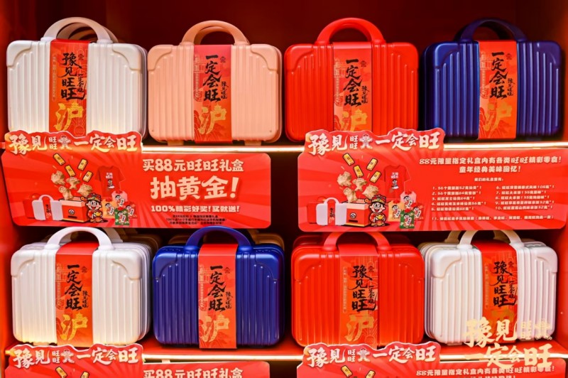 礼盒内含10款旺旺米果产品,其中56民族版仙贝/雪饼、芝士仙贝等特色口味凸显了产品矩阵的丰富性。礼盒搭配的“旺运锦囊+手机贴”盲盒设计,则巧妙利用“集齐心态”刺激复购——现场有消费者为获得“财运旺”版本连续购买三套礼盒。而购买礼盒可参与抽老庙黄金金条的活动,进一步放大了礼品的“增值感”,更契合礼品消费需求。