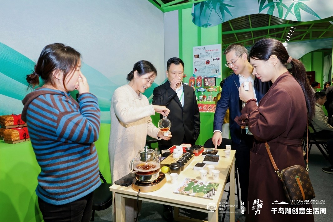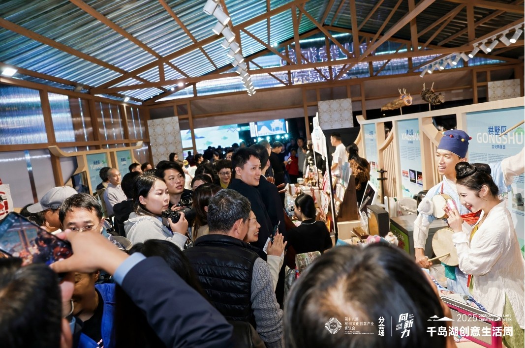 从2022年的三省四市九区县(市)到今年的十二省二十四市三十八县(市),朋友圈不断扩大,作为千岛湖创意生活周的重要内容,新安文化的传承创新和区域联动以多种形式贯穿始终。在“新安文化朋友圈”展区,安徽的文房四宝、苏州的丝绸、景德镇的陶瓷、衢州的开化纸等来自新安江流域及周边地区的特色文创产品齐聚一堂,共同讲述着流域文化的多彩故事。这些展品不仅展现了地域文化的独特魅力,也体现了新安文化在历史长河中的交融与演进。