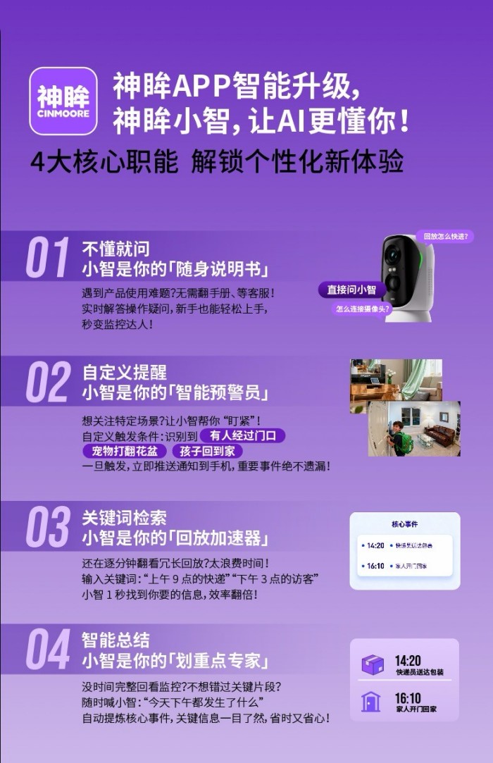 新升级的神眸APP推出神眸小智AI管家,已完成自主指令摘要报告、智能检索监控、高光时刻视频生成、智能配音、文案生成等多种智能功能。“有问题找小智”成为产品核心交互方式,一上线就获得用户的快速认同,再也不用几个小时查找监控,这种高频升级迭代的智能管家模式,节约用户时间,海量素材和废片,在神眸都是回忆的珍藏,安全的主动权交给用户,使神眸成为首个不断升级智能管家的AI智能影像行业尖货。
