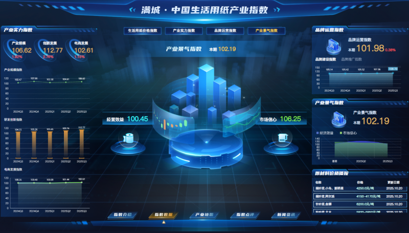 指数最新监测结果显示,2025年9月,生活用纸价格指数为97.47点,相较于2024年平均价格略有下滑。2025年三季度,产业实力指数、品牌运营指数分别达107.86点、101.98点,较上期分别提高2.18点和0.39点;产业景气指数则为102.19点,位于荣枯线以上——满城纸业,正展现出强劲的发展活力。