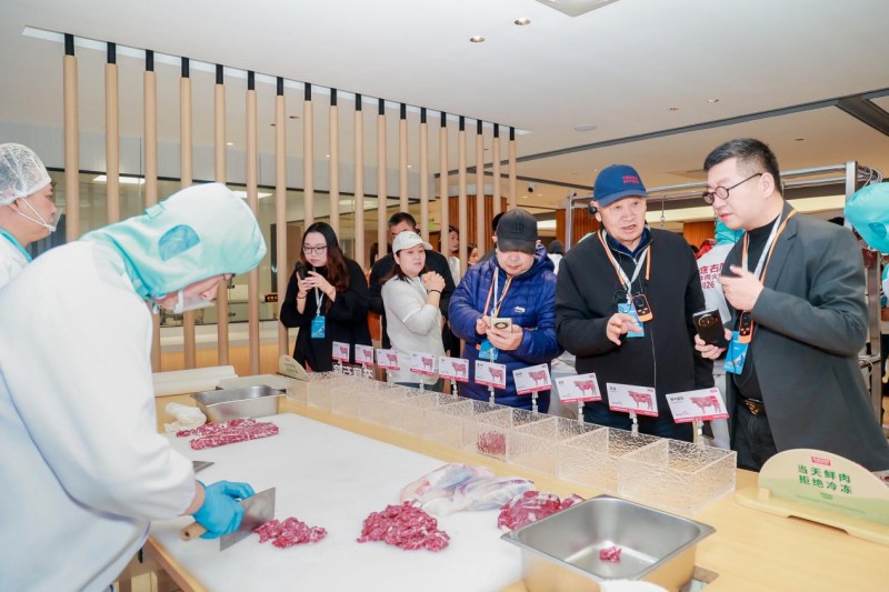 参观环节结束后,一场“庖丁解牛”现场秀将活动氛围推向高潮。屠场师傅手持专业刀具,对刚屠宰完成的新鲜牛肉进行精准分割——锋利的刀刃划过牛肉肌理时,可见肉质纤维清晰分明,部分肉品甚至还能看到细微的肌理跳动,直观展现“鲜度巅峰”的状态。