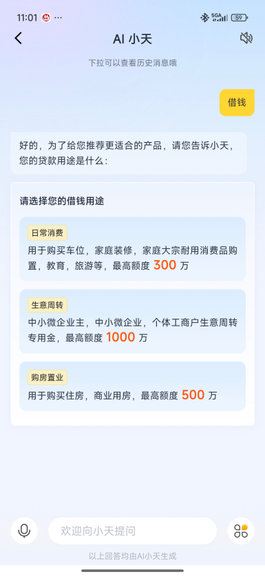 交互革命:从“翻界面”到“聊业务”,方言操作打通服务堵点 “以前用手机银行,光找‘转账’入口就要翻半天,现在跟‘小天’说句四川话就能转钱,太方便了!”成都市民刘阿姨的体验,道出了不少用户的心声。 四川天府银行AI手机银行彻底重构交互逻辑,以“对话即服务”替代传统手动操作。用户无需记忆复杂功能路径,无论是“查本月工资到没到”“还信用卡账单”,还是“查年度消费账单”,只需用日常语言向AI客服“小天”提出需求,系统就能精准识别意图,自动补全信息并完成操作。针对西南地区用户语言习惯,产品特别适配四川话、重庆话等方言识别功能,识别准确率达95%以上;同时优化大字体显示、语音指令简化等适老化设计,让适老群体无需学习复杂操作,仅凭“说话”就能轻松使用核心金融服务,真正实现“零门槛”用卡。