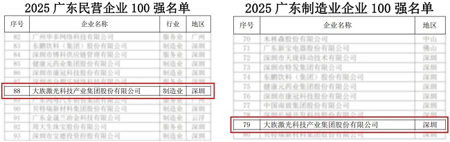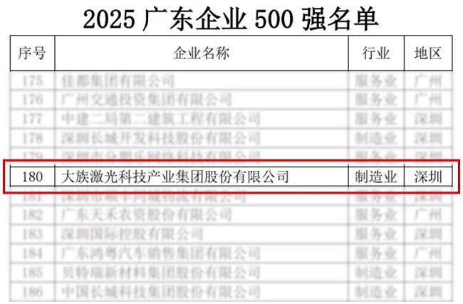 10月29日,广东省企业联合会、广东省企业家协会(简称“省企联”)在广州正式发布了“2025广东企业500强”及四大专项百强榜单。大族激光凭借卓越的综合实力,同时荣登“广东企业500强”“广东民营企业100强”及“广东制造业企业100强”三大榜单,展现其在先进制造领域的前沿地位与稳健发展态势。