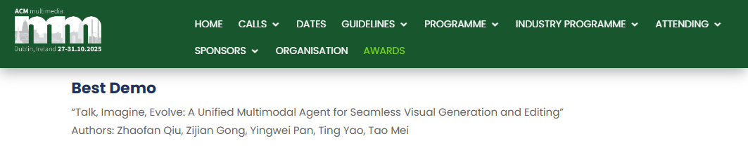 ACM国际多媒体会议由国际计算机学会(ACM)主办,致力于推动多媒体全领域的研究创新与产业应用落地,是全球多媒体领域最具权威性与影响力的学术盛会之一。每年会议评选的最佳演示奖,具有极高含金量和行业认可度,代表着评审委员会和与会学者对该技术创新性、实用性、成熟度和现场展示效果的最高肯定。