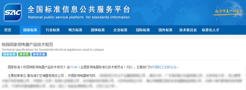 在这一背景下,2025年10月31日,中国家用电器研究院联合海尔空调主导的我国首个《校园用家用电器产品技术规范》国家标准正式发布,推动了行业的规范化发展。据悉,该标准将于2026年5月1日正式实施,填补了校园电器在安全、节能、环保等方面的规范空白,为校园电器产品的设计、生产与管理提供了可靠依据。