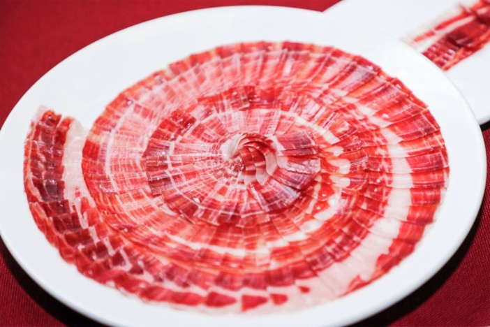 火腿切割艺术是这一传统最具代表性的体现之一。得到一片完美的火腿切片,需要有充足的耐心与技巧:火腿雕刻大师使用修长柔韧的刀具,以轻柔的锯齿状动作切出2至3毫米厚的薄片,切片的肥瘦比例均衡,入口便能细腻融化。摆盘方面,专家建议使用纯白色餐盘,将火腿切片从盘沿向中心摆放,遵循“少即是多”的理念,让火腿成为真正的主角。