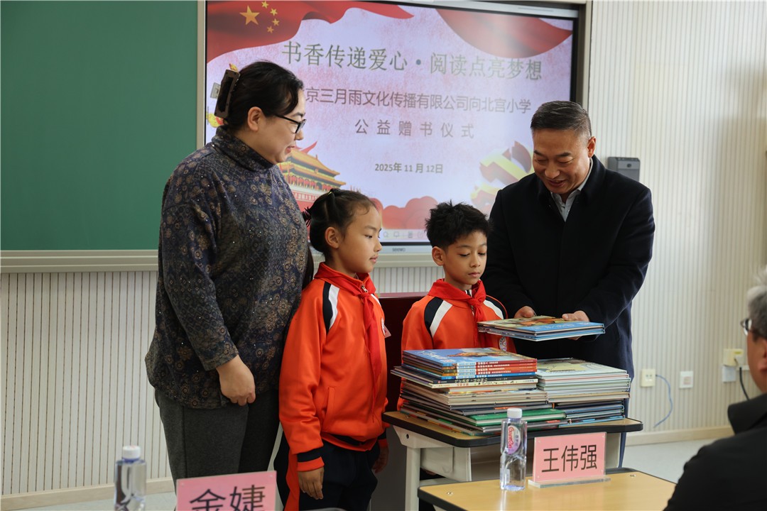 2025年11月12日,三月雨“书香传递爱心·阅读点亮梦想”公益赠书活动在北宫小学开展。出席活动的有北宫镇党委委员、组织委员王伟强,北宫小学校长金婕、副校长瑞晓辉及学生代表,北京三月雨文化传播有限公司党支部书记涂微、清风书苑图书馆馆长吴杏坤等。