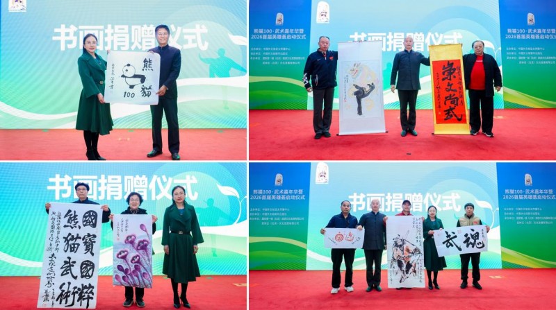 文化的力量,在武与文的交融中绽放。八位书画名家现场捐赠作品,以笔墨表达对武术的支持。随后,赵珺、张科、周亮等嘉宾共同按下启动装置,宣告“熊猫100·武术嘉年华暨2026首届英雄荟”正式扬帆启航。