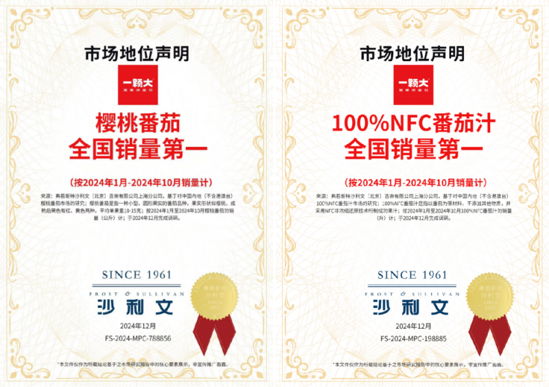 目前,一颗大™100%NFC番茄汁已受到众多渠道青睐,销售成绩亮眼,获得权威机构弗若斯特沙利文“100%NFC番茄汁全国销量第一”的市场地位认定。与此同时,一颗大™100%NFC番茄汁斩获了多项海内外荣誉,获得国际美味奖二星奖章、国际蒙特奖银奖、FBIF Wow食品创新奖等奖章,产品深受行业及消费者肯定。