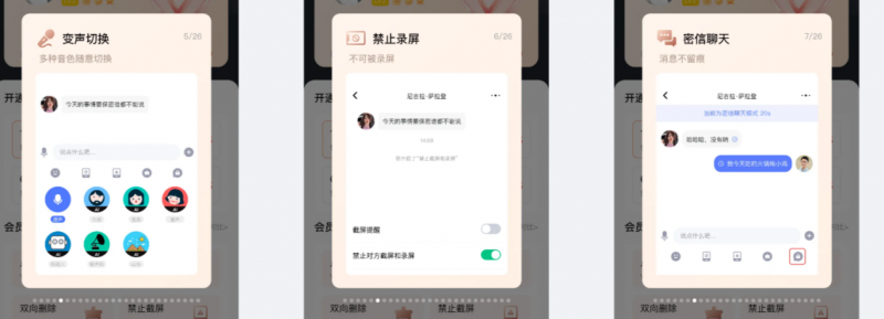 为了让大家更能保护个人的信息安全,密鸽从多维护度上提供了安全社交的功能使用,如【禁止截屏】、【禁止录屏】、【截屏惩罚】、【密信聊天】、【变声切换】等实用功能保护聊天信息的安全。