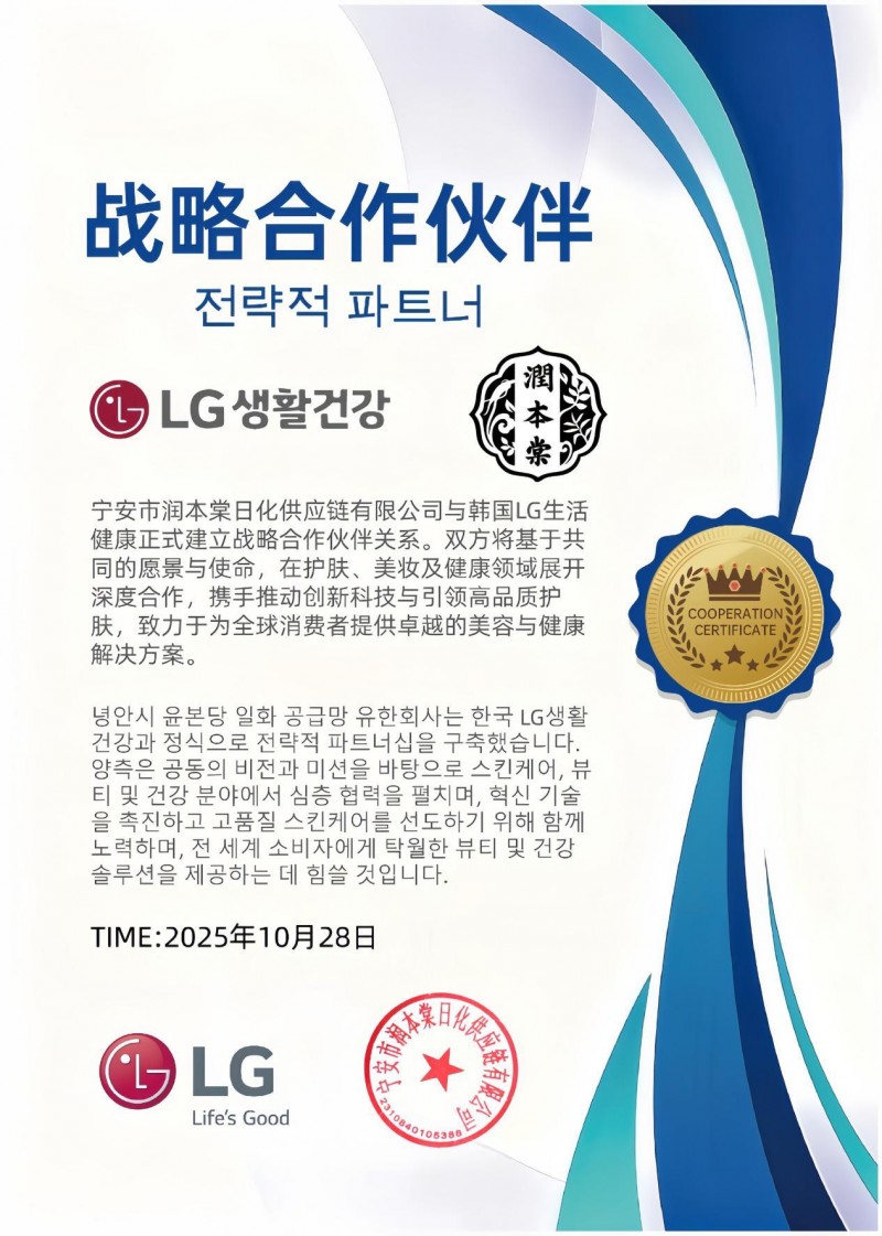 2025年,润本棠日化供应链有限公司 与韩国 LG生活健康集团(LG Household & Health Care)旗下SUM37°(숨37°)等品牌 正式签署战略合作协议。此次合作标志着中韩两大日化体系的深度融合与资源互补,也意味着润本棠正式迈入国际高端护肤品牌生态合作的核心体系。