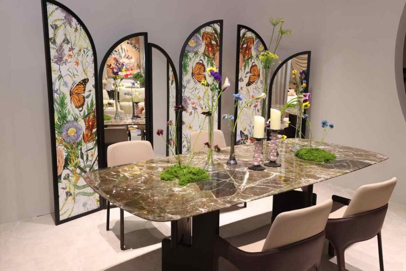 爱依瑞斯与艺术家Paola T.的合作,成为展位最受瞩目的亮点。Paola兼具建筑、景观与艺术多元背景,其作品常融合生物结构与自然意象。本次为爱依瑞斯创作的“冥想花园”纹样,以意大利春日花园为蓝本,融入破茧蝴蝶、蛇形图腾及缤纷花卉,构建了一个充满生命能量的视觉叙事。